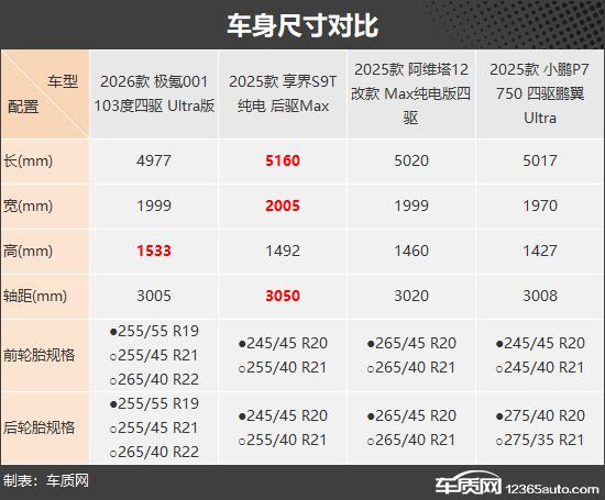 车身尺寸上,享界 S9T 在车长、车宽和轴距方面领先,作为注重实用性的旅行车,空间优势更明显。极氪 001 车身高度有优势,为乘客提供更充裕的头部空间。小鹏 P7 和阿维塔 12 的车身尺寸虽无突出亮点,但日常使用时车内空间也足够。