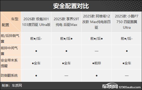 中大型车在安全配置上普遍表现良好,这四款车也达到较高水准,只是细节有差异。极氪 001 未配备后排侧气囊,享界 S9T 未搭载防侧翻系统,但两车整体安全防护仍完善。小鹏 P7 兼具这两项不足,阿维塔 12 是唯一未配备前排中间气囊的车型,其安全带未系提醒功能仅支持前排。