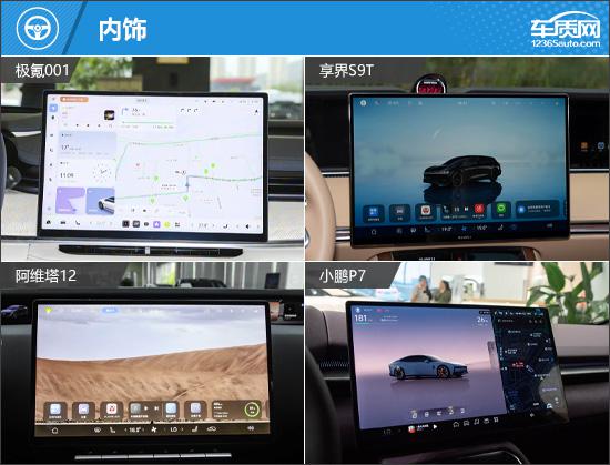 内饰部分,四款车中控台均采用主流简约风格和布局,只有极氪 001 和阿维塔 12 在中控屏下方保留了部分实体按键,极氪 001 也是四车中唯一用电子挡把换挡的车型。细节上,享界 S9T 的中控台设计更显厚重,凸显中大型车的尊贵气场;阿维塔 12 采用远端屏布局,不干扰驾驶视线的同时能更直观呈现车辆信息;小鹏 P7 配备的三辐式方向盘造型独特,搭配左右卫星旋钮,操作更便捷高效。
