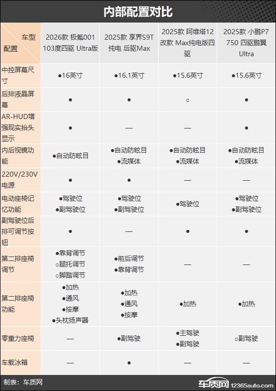 内部配置上,极氪 001 和享界 S9T 整体表现最全面。不过,极氪 001 未配备零重力座椅,有些遗憾;享界 S9T 是四款车型中唯一未提供副驾驶位后排调节按键的,与其尊贵定位不太相符。阿维塔 12 在第二排座椅功能上较保守,但它是唯一配备主驾驶零重力座椅的车型,人性化考量有诚意。小鹏 P7 在显示系统方面出色,后排液晶屏幕、AR - HUD 增强现实抬头显示及流媒体内后视镜都有。