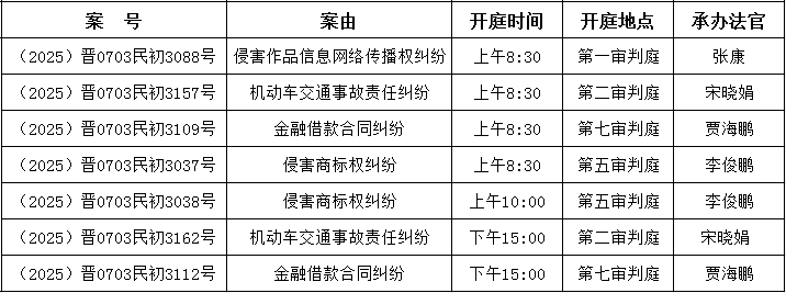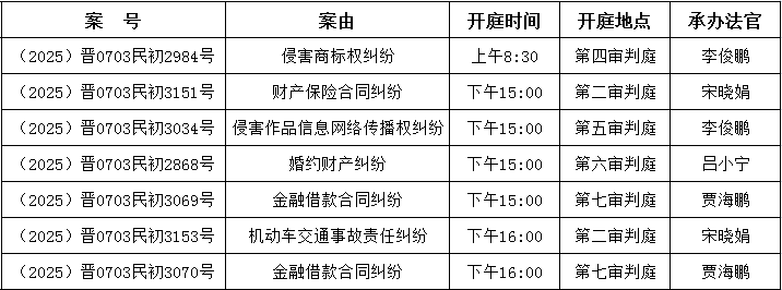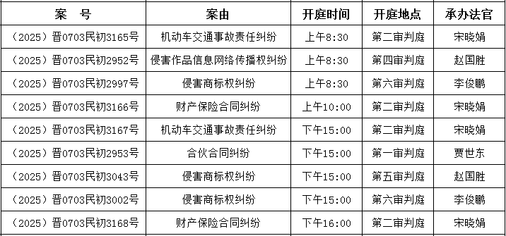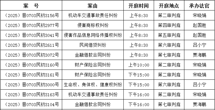 小编为大家整理了2025年11月10日至11月14日开庭审理的案件。若您的案件在此公告中,请准时参加开庭;若没有您的案件,感兴趣的朋友也可携带身份证前来旁听。除法律规定涉及国家秘密、商业秘密、个人隐私以及当事人申请不公开的案件外,均为公开审理。此开庭信息为提前整理所得,由于案件审理中可能出现调解、撤诉、延期审理等特殊情况,开庭时间可能会进行排期调整。若与实际开庭时间、地点不符,以实际情况为准。