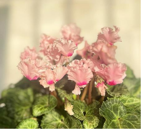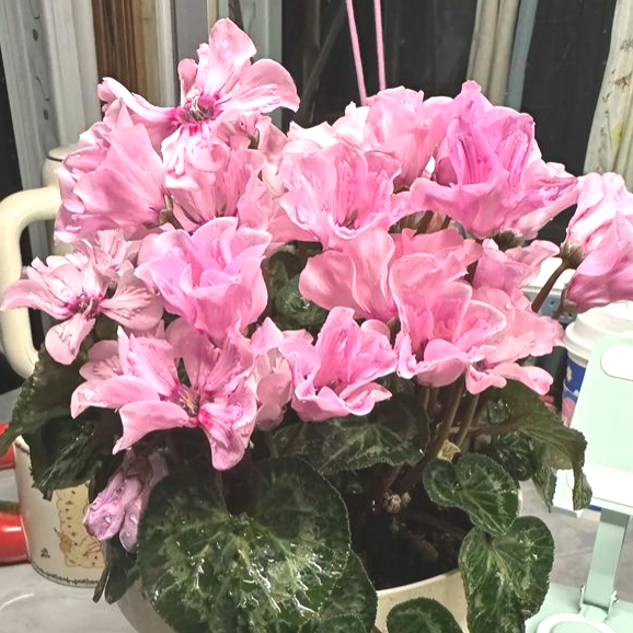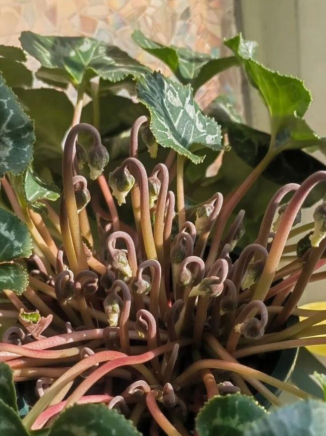 仙客来花叶共赏,是个优等生。只要阳光充足、肥水适量,花朵就会不断从叶下冒出,花期超长,可一直开到明年5月。