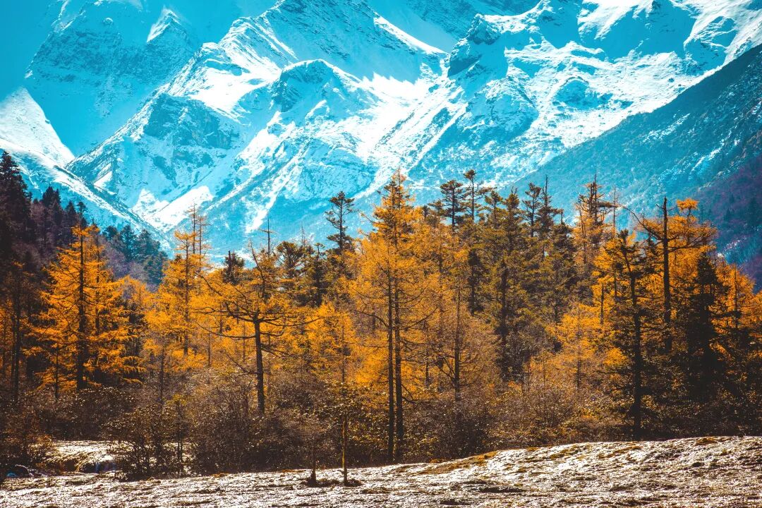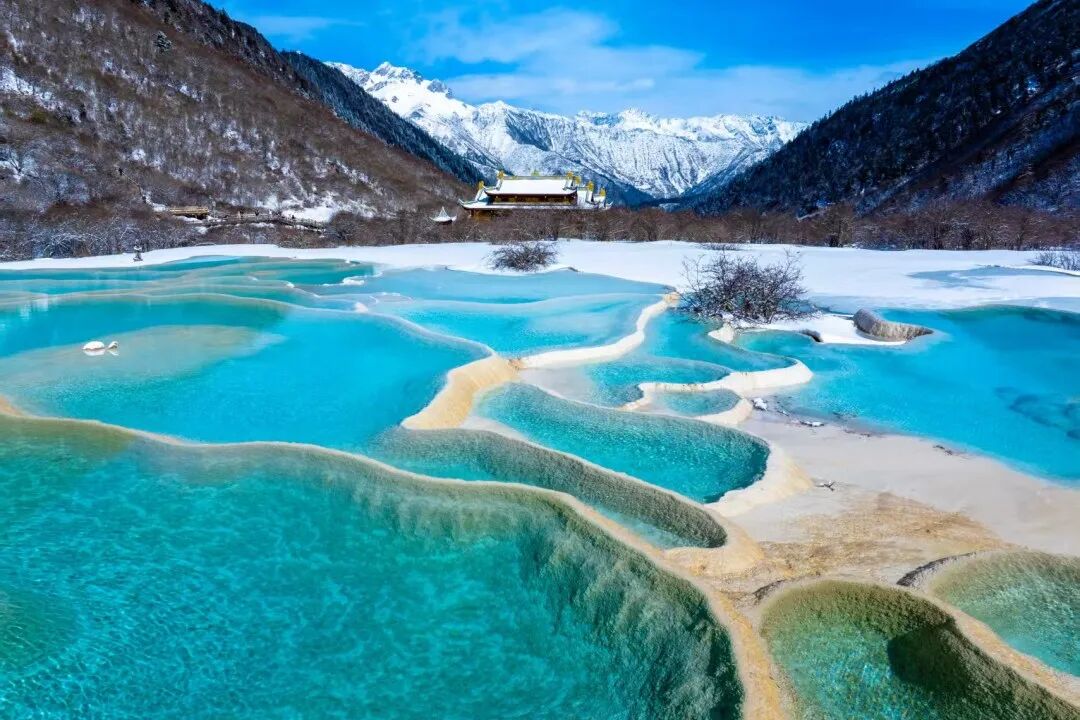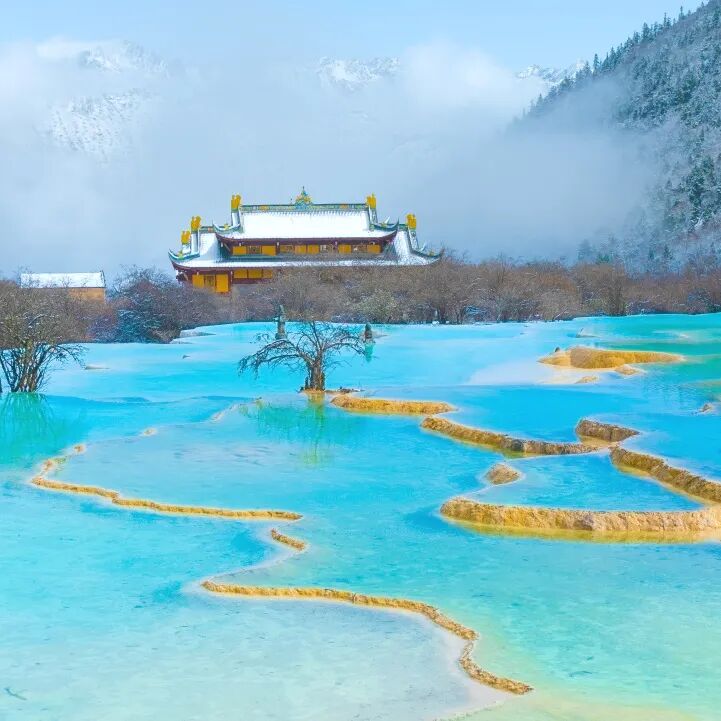 长达1.3公里的钙华滩流金沙铺地如一条金色巨龙,在雪山的映衬下更显壮观。而黄龙古寺的红墙古寺在金黄树叶和白雪的点缀下,更显古朴庄严,是拍照的绝佳背景。