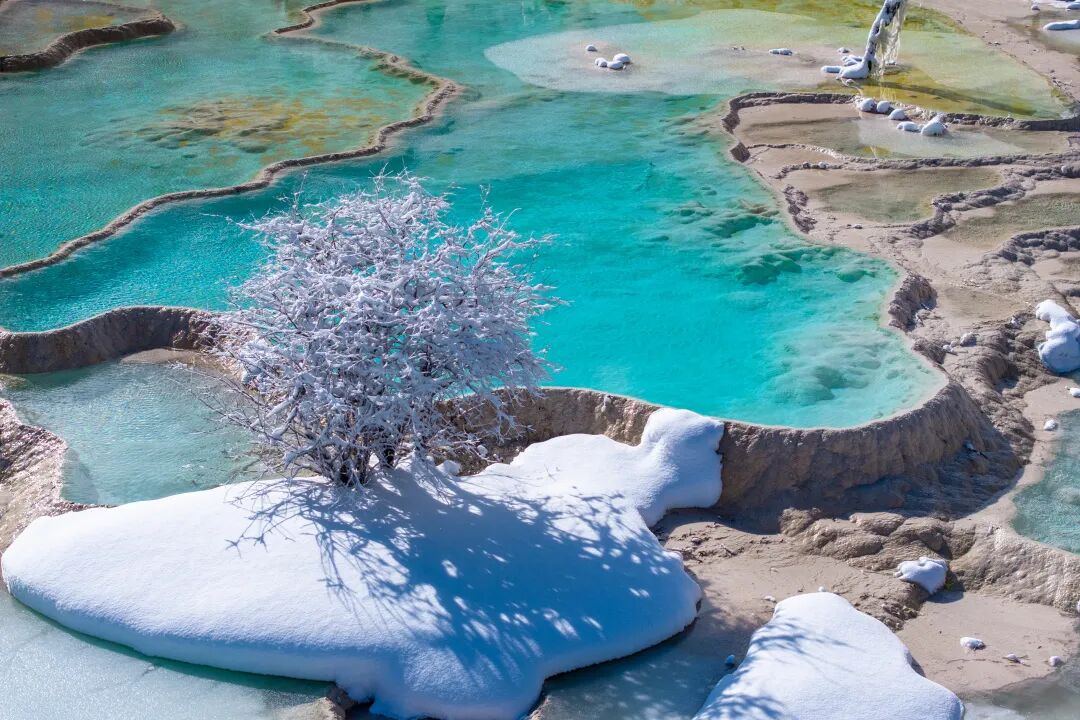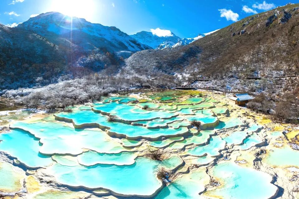 秋冬的黄龙美景不容错过。趁着这个难得的秋假,带着孩子来黄龙吧!初雪点缀下的黄龙沟,彩池更加晶莹,山林披上了金白相间的外衣。高处远眺,雪山巍峨,彩林绚烂,钙华池碧蓝如洗,这秋冬交汇的奇景,足以让每一个来访者惊叹大自然的神奇造化。