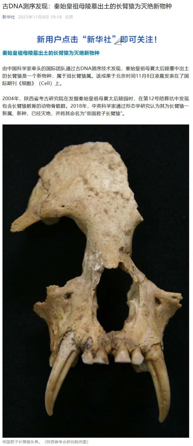 古DNA测序揭秘:秦始皇祖母陵墓出土长臂猿为灭绝新物种