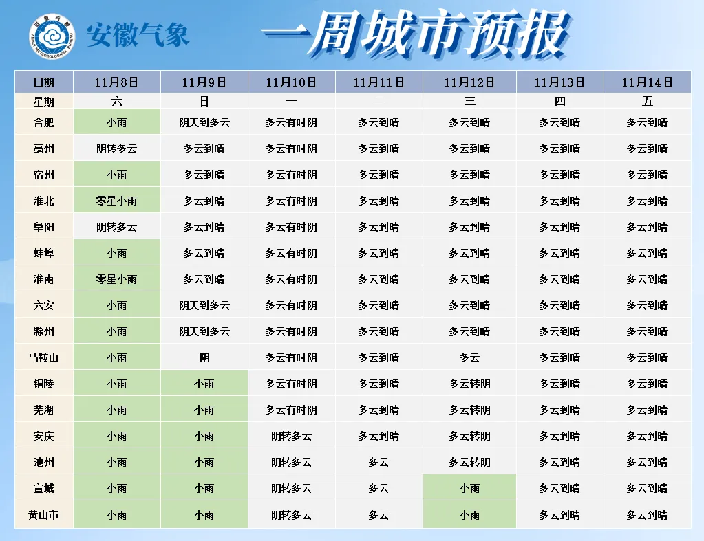 未来一周,除今天安徽淮河以南阴雨天气持续;12日江南有小雨,南部中雨。其余时间全省以多云到晴天气为主。