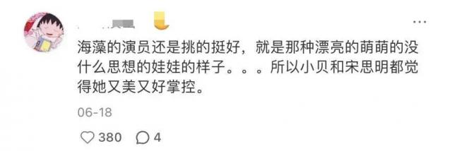 海藻没有这样的格局,但网友对她格外包容,这或许得益于选角。海藻设定并非大美女,宋思明的太太见到她后说,她不符合情妇的审美标准,“没胸没腿没魅力,就是白了点”。