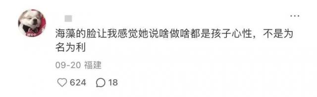 难怪有网友说:“海藻的脸让我感觉她说啥做啥都是孩子心性,不是为名为利。”“她一点都不贪财,顶多就是贪玩罢了。”