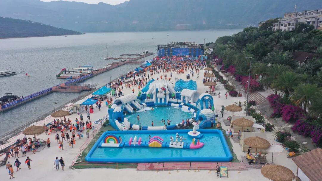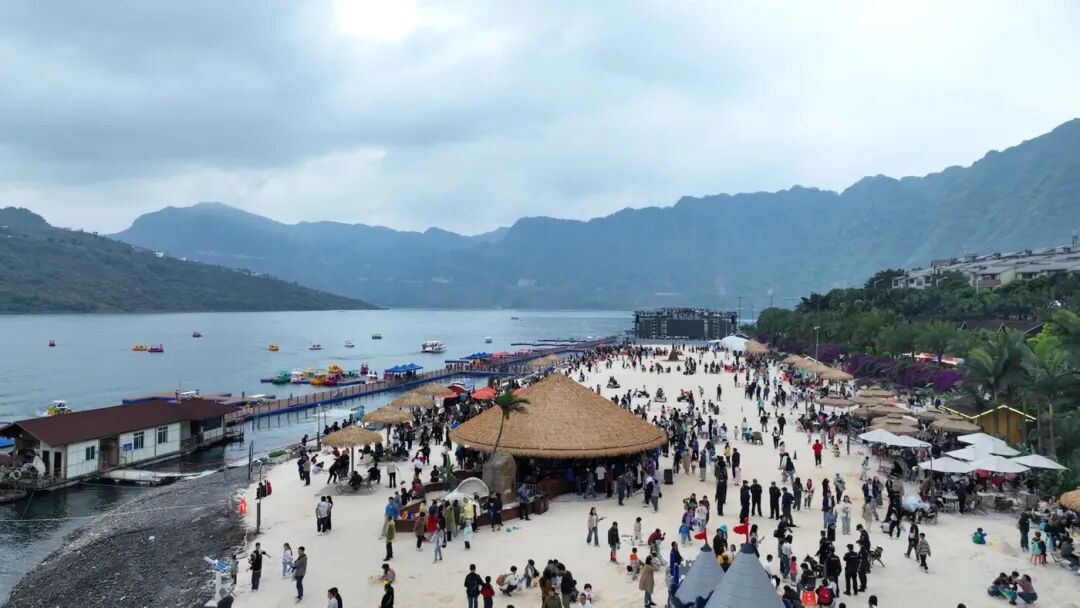 转机出现在近年来水富市对旅居产业的大力发展上。依托库区“高峡平湖”的独特风光和优质温泉资源,当地创新采用“党建引领 + 龙头企业 + 村集体经济 + 合作社”模式,以“金沙第一湾,滇川小三亚”为定位,对景区旅游基础设施进行升级。围绕“一山一水一镇一沙滩”进行布局,原本的移民安置小镇逐渐建设成为集温泉中心、无边泳池、美食街区、水上运动中心、酒店露营于一体的旅居综合体。同时,农贸市场、警务室、卫生室、停车场等配套设施也得到优化,318栋民房完成风貌改造。沙滩音乐节、篝火晚会、电音泼水节等特色活动接连不断,让邵女坪成为川渝游客休闲度假的热门之选。
