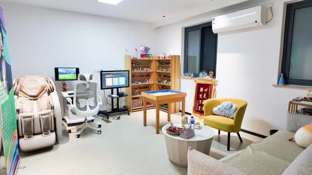如果说科普馆是“认知启蒙站”,那么万里无忧·心理健康互助大联盟工作室就是“心灵补给站”。这支由9个职能部门、3个专业中心、8家自治组织和5家社会力量组成的队伍,用专业服务打造温暖细节。可爱的解压玩具、专业的心理沙盘、疗愈类书籍,搭配舒适的按摩躺椅,为居民提供了放松的“小角落”。这里还引入了与普陀区精神卫生中心合作的心理科普仪,具备心理测评、科普知识查询、专家预约指引等功能,居民在社区内就能完成初步心理评估与专业咨询对接,实现“从了解心理到寻求帮助”的无缝衔接。