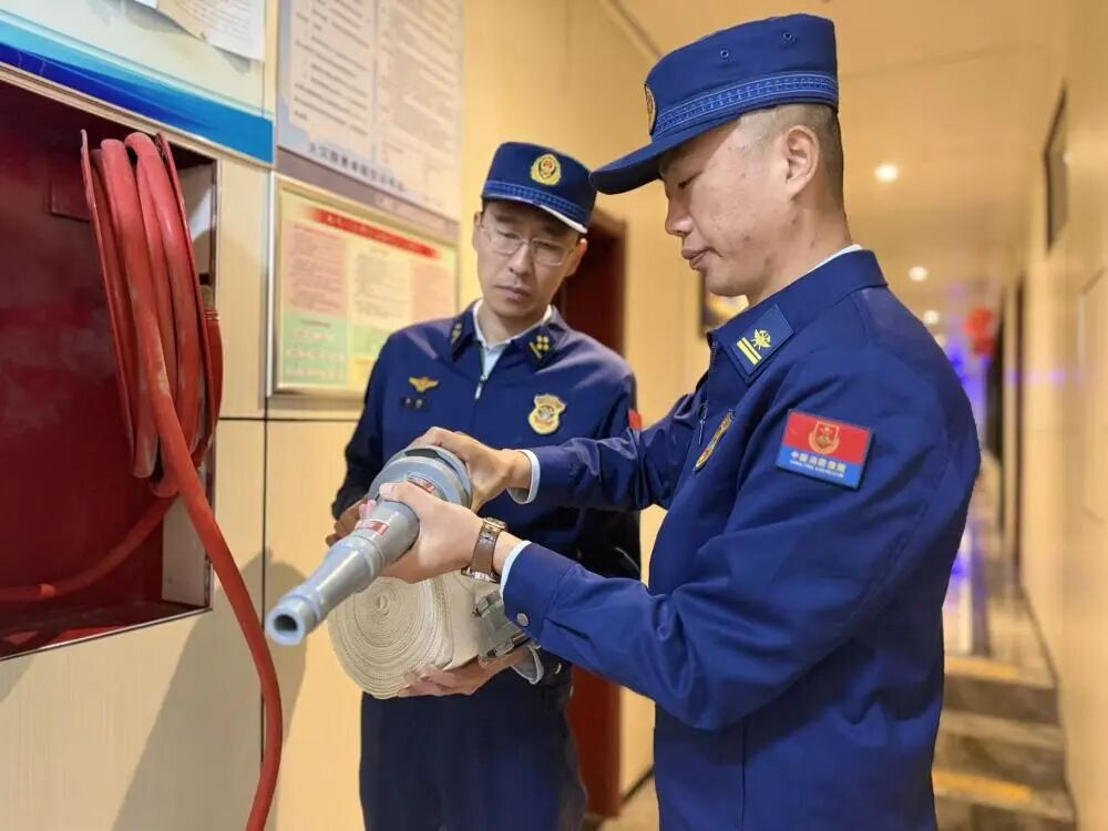 消防指战员在检查岱顶消防安全重点单位室内消火栓完好程度。新华社记者张钟仁摄