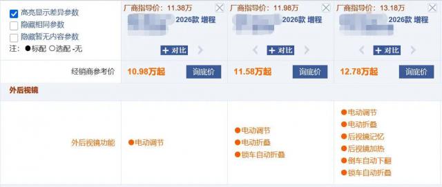 查看市面上新款车型的配置表,规律十分明显。“外后视镜功能”一栏,等级划分清晰:入门版仅标注“电动调节”;中配可能增加“电动折叠”;只有花高价购买顶配、次顶配车型,才能看到“后视镜加热”“锁车自动折叠”等字样。