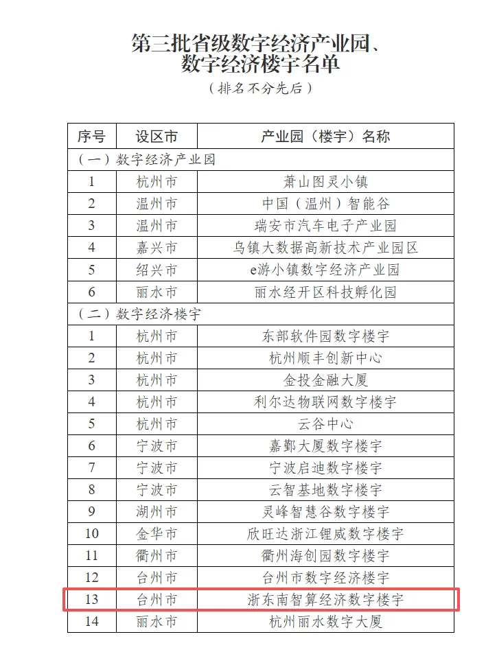 近日,浙江省经济和信息化厅公布了第三批省级数字经济产业园、数字经济楼宇名单,我区浙东南智算经济数字楼宇成功入选省级数字经济楼宇。