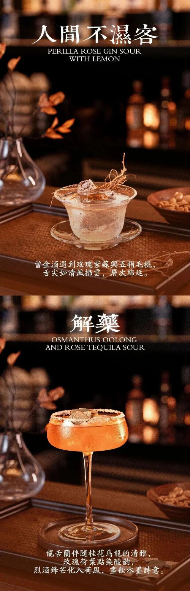 “夜酒”主推“人间不湿客”,以玫瑰紫苏茶为底,搭配五指毛桃和金酒。入口是紫苏与柠檬的鲜爽,饮罢有梅子回甘,如青云拂过舌尖。“黄袍加奶”以黄酒为魂,杜仲与湖南茯茶打底,温热慢煨出绵密醇香。