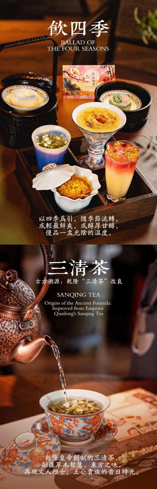 “朝茶”推荐款“饮四季”,四款茶各代表一个季节。春酿茉莉花茶融合青瓜沁甜;夏萃桂子乌龙叠加椰子清冽;秋煨山楂柑普蕴含菊花清雅;冬暖红茶花香裹挟枸杞甘润。“三清茶”承袭古方精髓,明前龙井佐以佛手、松仁、茉莉,以茶养心。