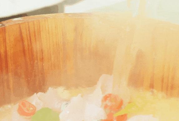 在烹饪过程中,用鹅卵石加热到高温,铺到木桶底部去烤制去了刺的鲜嫩鱼片,将鸡与鱼骨熬制的鲜美浓汤浇到烧红的石头上,特别的仪式感与鲜美味道非同凡响。