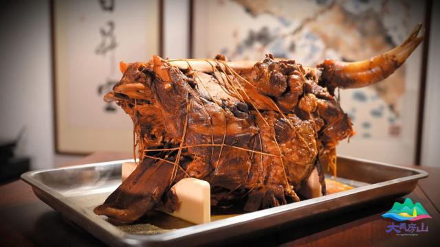 牛头宴是房山最具豪迈气息的待客硬菜,选用新鲜完整的牛头,经过浸泡、焯水、去腥等多道预处理工序,再用秘制卤料文火慢炖十几个小时,直至肉质软烂入味。