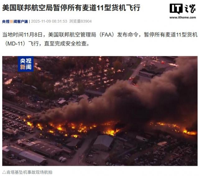 IT之家11月9日消息,据央视新闻报道,当地时间11月8日,美国联邦航空管理局(FAA)发布命令,暂停所有麦道11型货机(MD - 11)飞行,直至完成安全检查。
