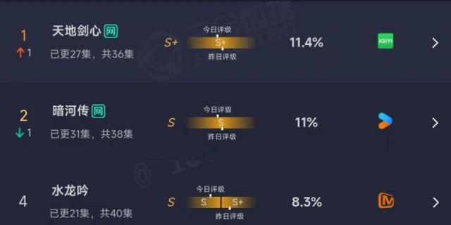 《天地剑心》《暗河传》《水龙吟》这三部大男主剧尚未收官,云合市占率就已停止增长。排名最靠前的《天地剑心》目前市占率仅为 11.4%,《暗河传》紧随其后为 11%,《水龙吟》则只有 8.3%。