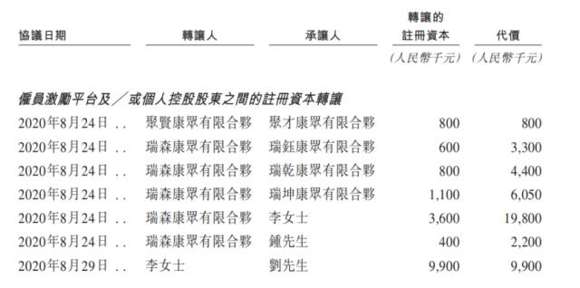 但在2020年4月,瑞森康众有限合伙分别向领汇基石、同伟资产管理转让25万元、40万元注册资本,套现625万元、1000万元。同年8月,公司部分股权在瑞森康众有限合伙、聚贤康众有限合伙、李辉、钟要齐等员工激励平台和个人控股股东之间进行了转让。