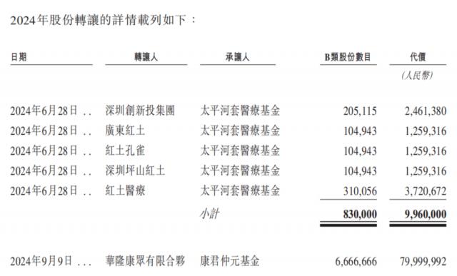 2024年6月,深圳创新投集团实体向太平河套医疗基金转让83万股股份,套现996万元;华隆康众有限合伙向康君仲元基金转让666.67万股股份,套现8000万元。