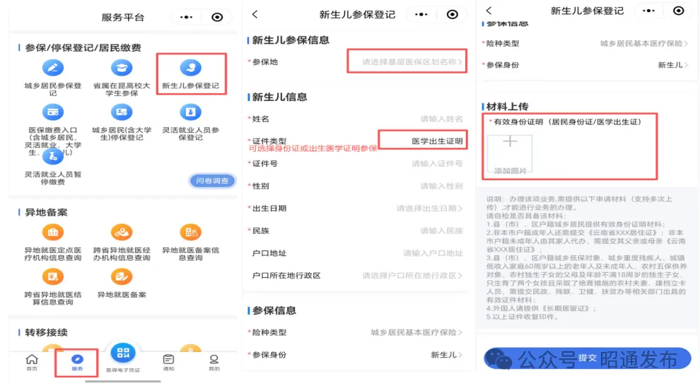 第二步:完成参保登记。点击【服务】进入页面,找到“参保/停保登记/居民缴费”模块,点击“新生儿参保登记”,选择“参保地”,输入新生儿基本信息,比如“姓名”“证件类型”“证件号”“性别”“出生日期”“民族”。上传出生医学证明或者身份证后提交。