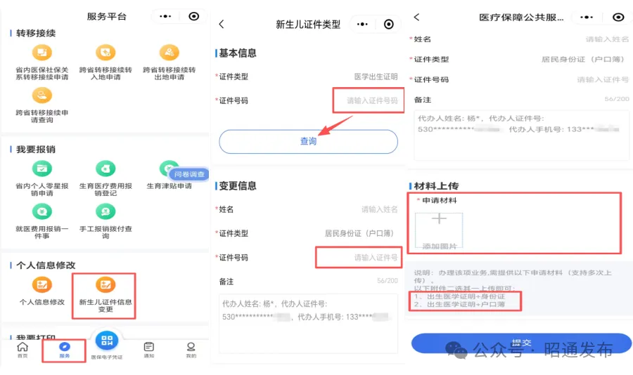 点击【服务】进入页面,找到“个人信息修改”模块,点击“新生儿证件信息变更”功能,输入新生儿的“出生医学证明编号”,点击“查询”,查出新生儿基本信息后,姓名不可更改,再输入新生儿“身份证号码”。材料上传“出生医学证明 + 身份证”或者“出生医学证明 + 户口簿”,点击【提交】就行。