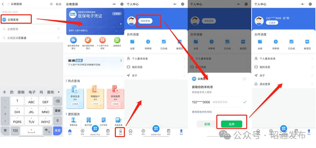 第一步:授权登录。打开微信或者支付宝,搜索“云南医保”,点击“我的”,然后进行授权登录,登录成功即可。