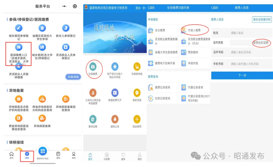 打开“云南医保”小程序,点击【服务】进入页面,找到“参保/停保登记/居民缴费”模块,点击“医保缴费入口(含城乡居民、灵活就业、大学生、新生儿)”功能,会跳转至税务渠道进行缴费。