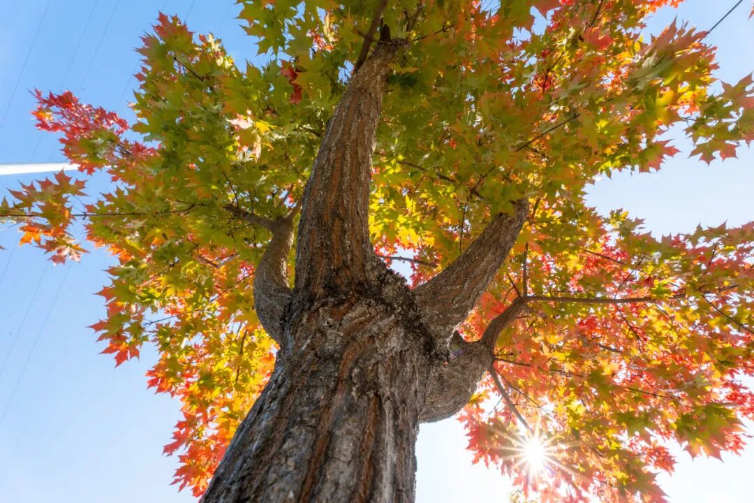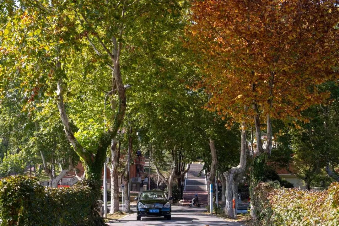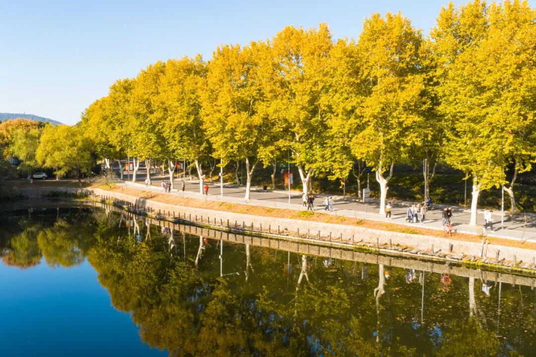 “金风细细,叶叶梧桐坠”。换个角度仰望,校园的道路仿佛变成了流动的诗行。