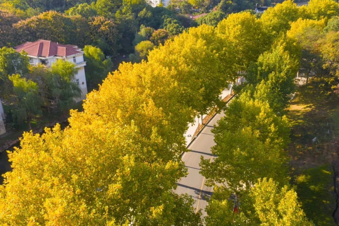 航拍镜头下,厚学北路两侧,金黄与深红交织成一条美丽的长廊,它不仅通往教学楼,更通往知识的殿堂。