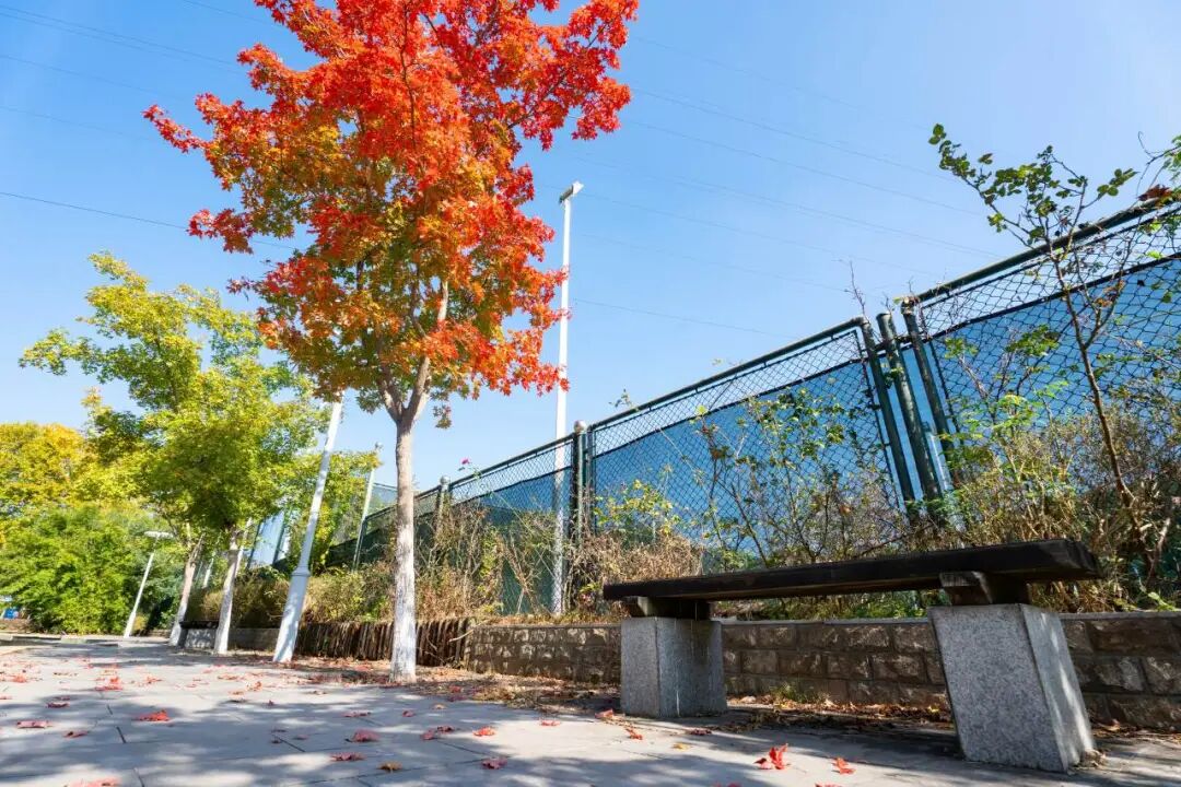 天宝阁前,粉黛乱子草如云似雾,营造出朦胧浪漫的氛围;体育馆旁,枫叶逐渐变得绯红,展现出热烈奔放的姿态。