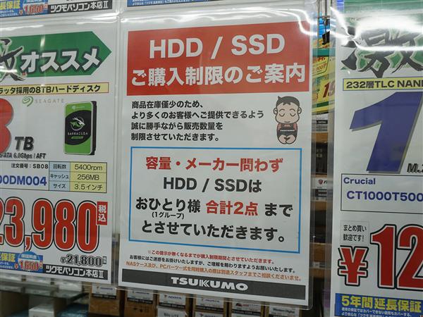 其中,PC Shop Ark规定每组购买商品数量“最多8件”,而两家TSUKUMO商店更为严格,将购买数量限制为“每组最多2个SSD/HDD和最多4张内存条”(购买整机或NAS时可协商)。