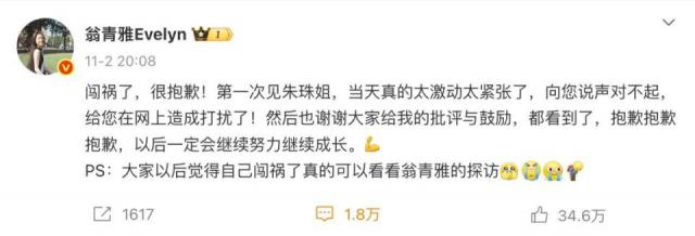 采访翻车后,有网友和粉丝替她辩解,说“小女孩第一次直播采访,难免紧张不适应,多给些机会就好”。人无完人,犯错可以改正,但翁青雅似乎又搞砸了。她发了条道歉微博,最后那句“大家以后觉得自己闯祸了,真的可以看看翁青雅的探访”,被网友吐槽“吊儿郎当”。翻看评论,前排都是吐槽,有人直接反驳她,说“不是紧不紧张的问题,是你根本没做任何准备,哪怕多背几遍词呢”。