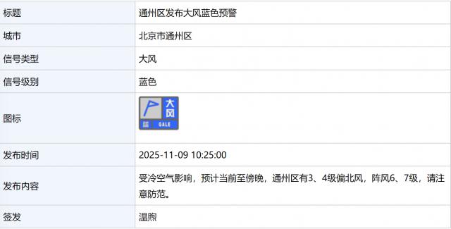 受冷空气影响,预计当前至傍晚,通州区有3、4级偏北风,阵风6、7级,请注意防范。
