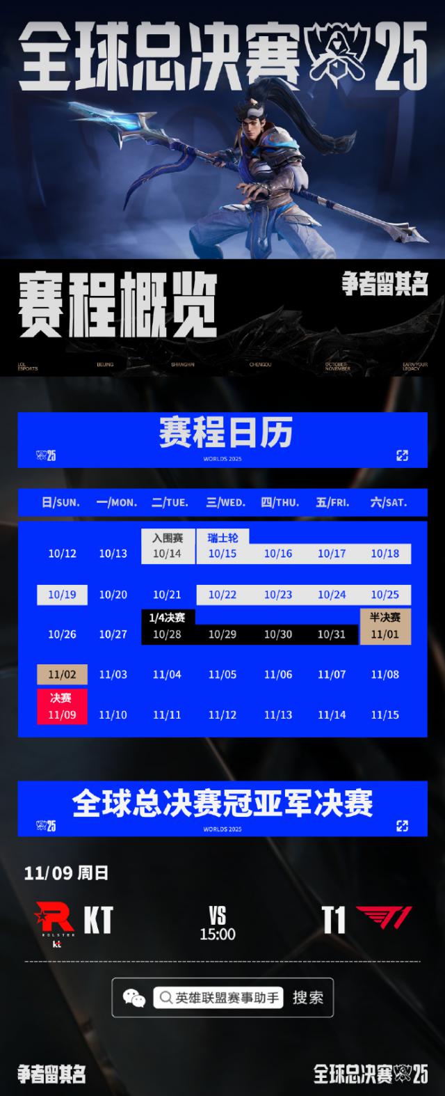 其中,10月28日至11月2日,8强队伍前往上海标志性的梅赛德斯 - 奔驰文化中心,展开淘汰赛对决。11月9日,《英雄联盟》2025年全球总决赛冠亚军决赛将在成都东安湖体育公园多功能体育馆举行。