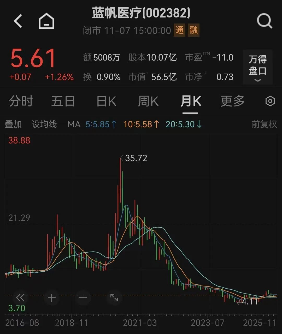 2020年蓝帆医疗净利润和股价创历史新高后,随着净利润下滑和亏损,股价开启暴跌。自2020年7月高点至今,跌幅超80%,目前市值为56.5亿元。