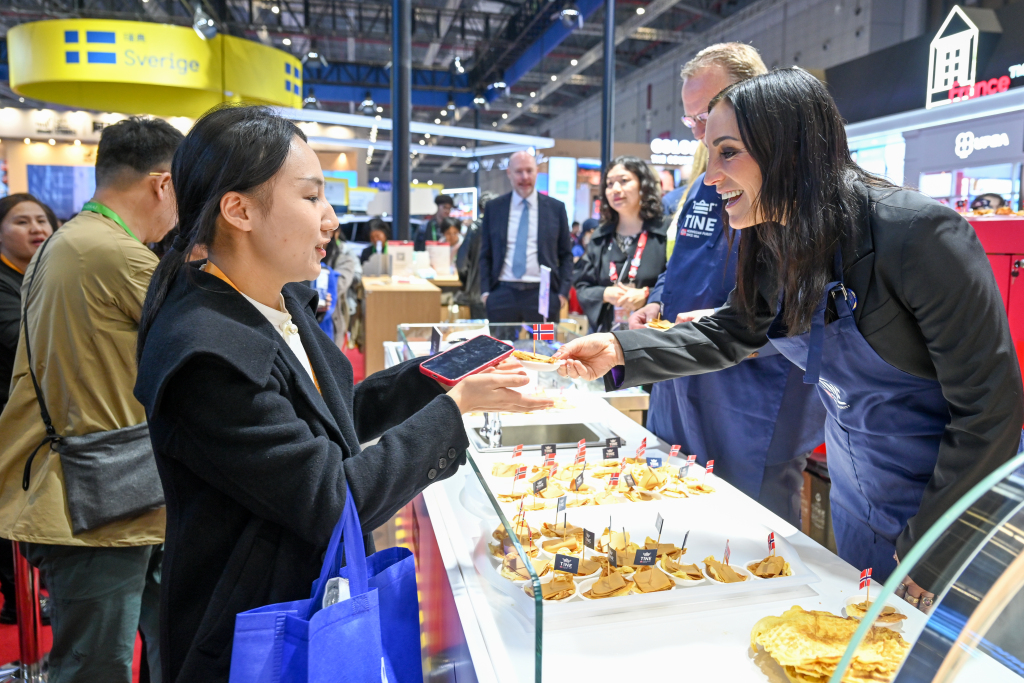 2025年11月7日,国家会展中心(上海),挪威国家馆,挪威农业和食品部国务秘书汉娜 - 贝里特·布瑞克为来宾派发以挪威棕色奶酪制作的华夫饼。澎湃新闻记者 朱伟辉 图