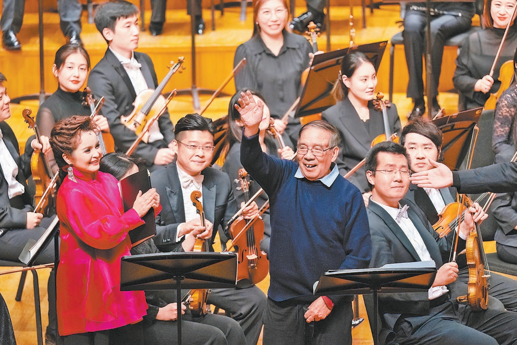 吴碧霞、黄训国的演唱同样精彩,特别是在《小河淌水》《看秧歌》等选段中,吴碧霞的美妙高音与混声合唱的互动鲜明流畅,总博得热烈喝彩。最后一曲《孳孳》唱响,余韵中,鲍元恺登场向观众致意,笔耕不辍、用几十载时光丰盈“炎黄风情”的作曲家,收获全场经久不息的掌声。