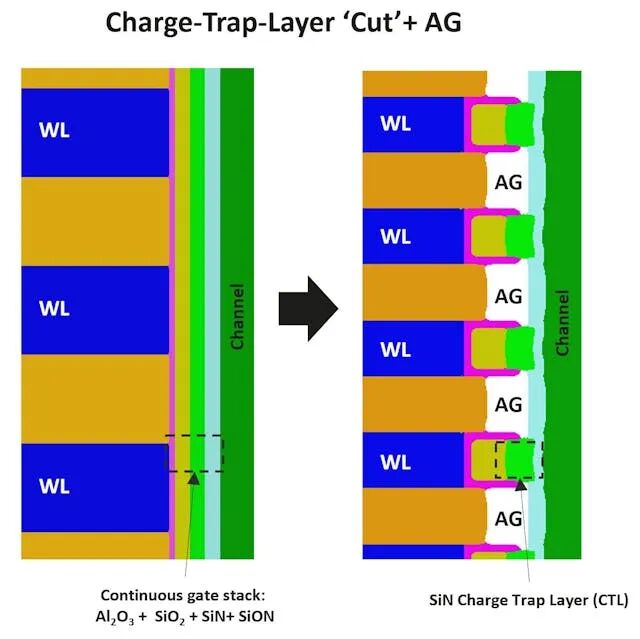 5. 连续栅堆叠(左)与具有电荷陷阱层切割和气隙集成的栅堆叠(右)之间的区别。