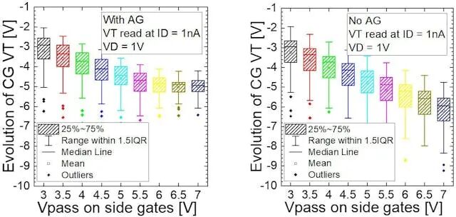 结果表明,带气隙的器件对相邻单元干扰更不敏感,通过在未选栅极施加“通电压”时阈值电压偏移更小得出此结论(图4)。该结果在测试器件上获得,该器件字线层有限,间距30 nm,存储孔直径80 nm。
