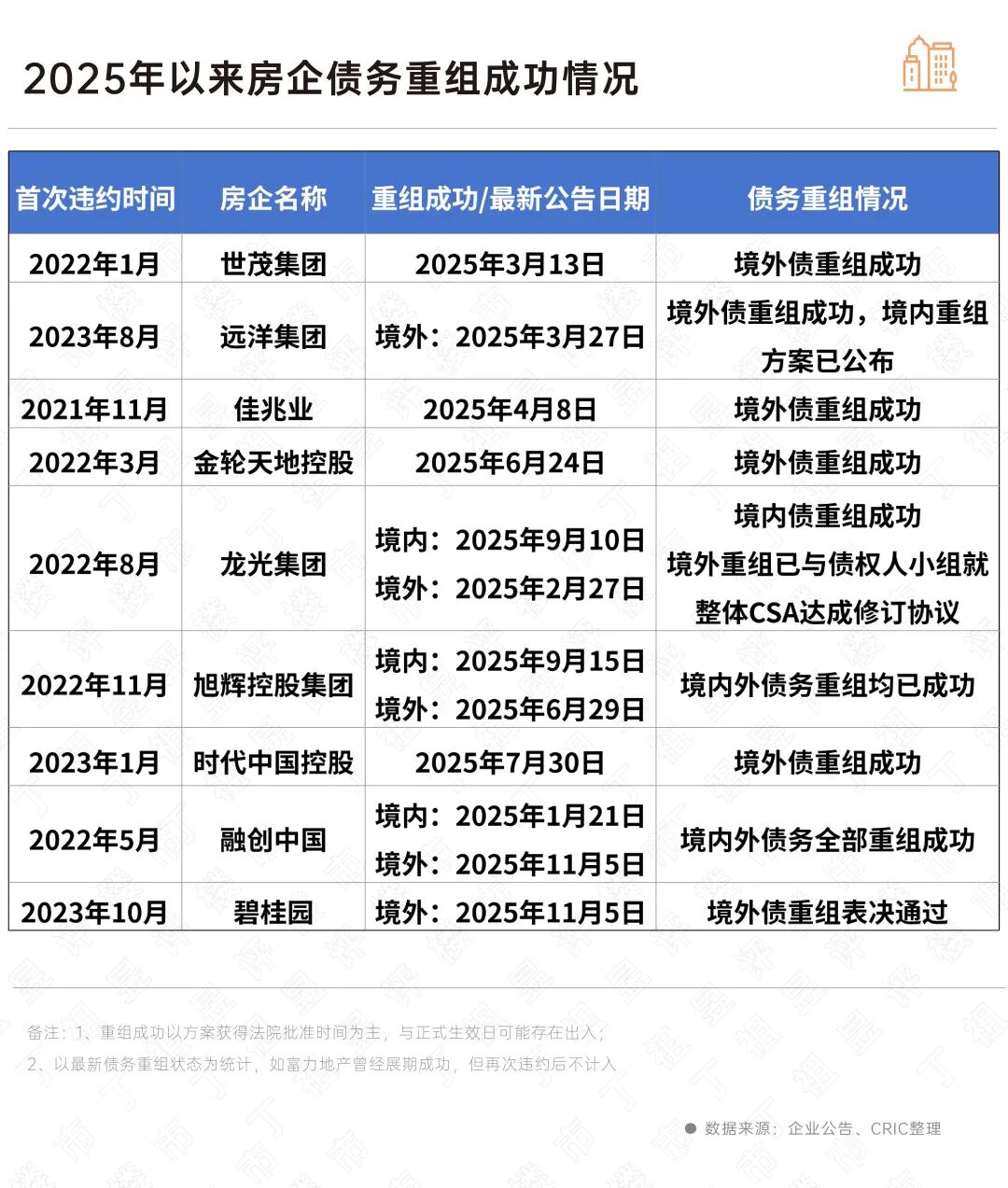 据CRIC不完全统计,42家房企披露了重组相关计划或方案,17家完成全部或部分债务重组,其中9家是2025年重组方案获批。