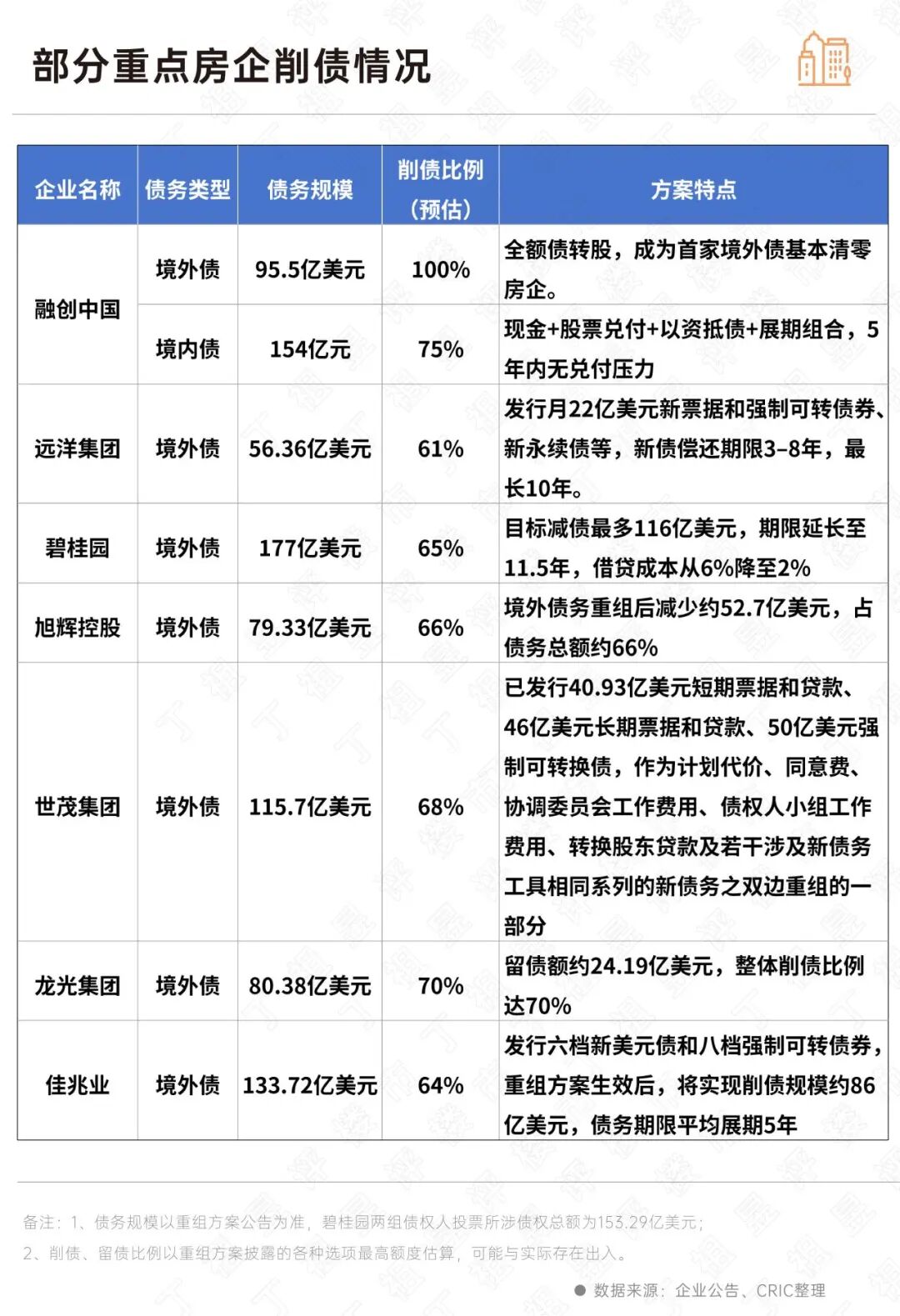 先看融创,年初融创中国率先完成约154亿元境内债重组。近期约96亿美元境外债重组方案获法院批准,融创成为首家实现境内外债务全面重组的头部房企。