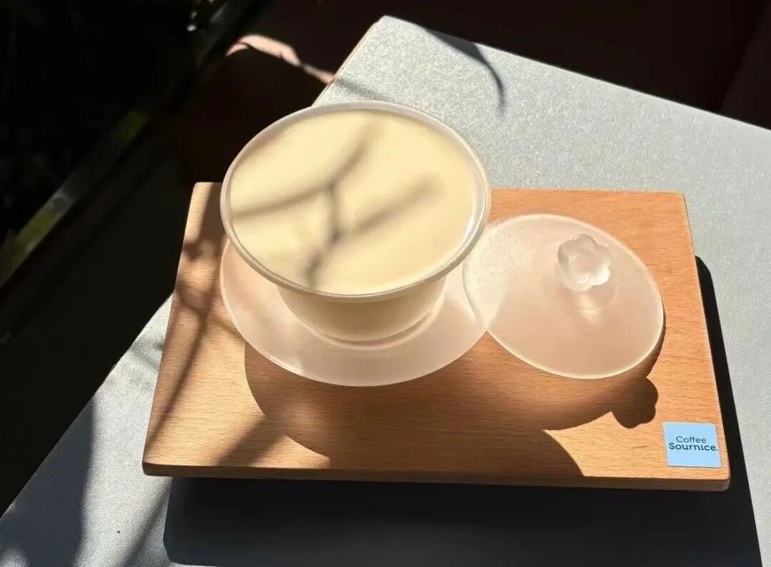 这款产品的另一个亮点,是用中式盖碗来装咖啡。透明的磨砂盖碗不仅展现了咖啡绵密的质地,还成为绝佳的拍照道具。网友们纷纷分享:‘盖碗一上,故事感就来了’‘原来咖啡也可以这么中国风’‘这就是中国版的‘冰卡布’吧’。