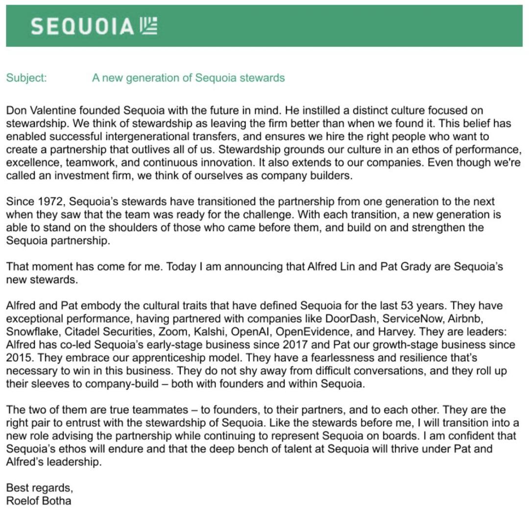 本周早些时候,美国知名VC红杉资本(Sequoia Capital)突然发布公告,宣布第三代掌门罗洛夫·博塔(Roelof Botha)辞职,林君叡(Alfred Lin)与帕特·格雷迪(Pat Grady)成为新一代领导者。
