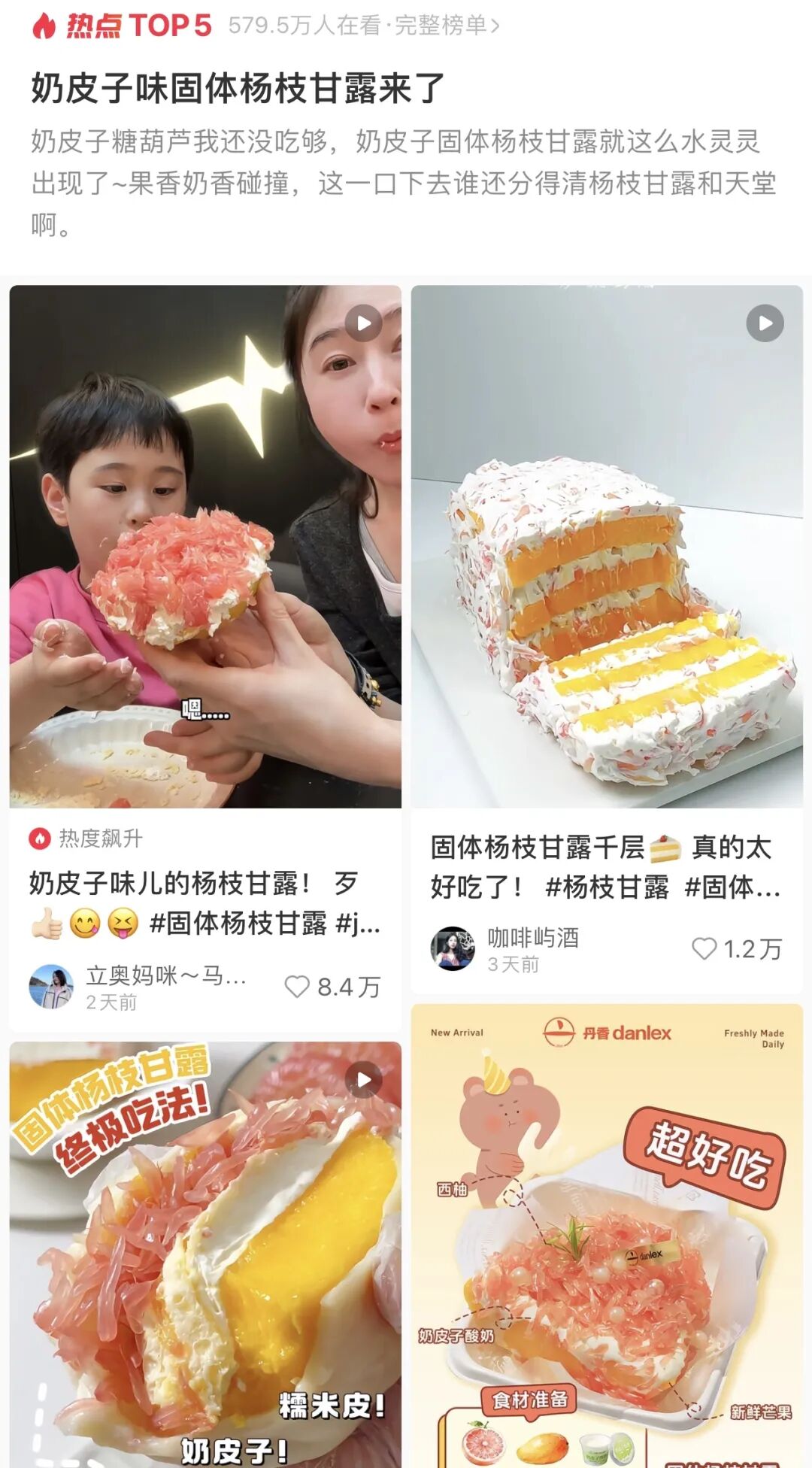尽管如此,奶皮子的网红爆款之路仍在继续。比如,小红书热点榜显示,11月8日,奶皮子与固体杨枝甘露结合,生成热门话题#奶皮子味固体杨枝甘露来了,相关内容已有579.5万人在看。