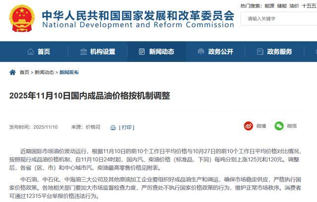 11月10日,国家发改委网站发布消息,近期国际市场油价波动。依据11月10日前10个工作日平均价格与10月27日前10个工作日平均价格的对比情况,按照现行成品油价格机制,自11月10日24时起,国内汽、柴油价格每吨分别上调125元和120元。