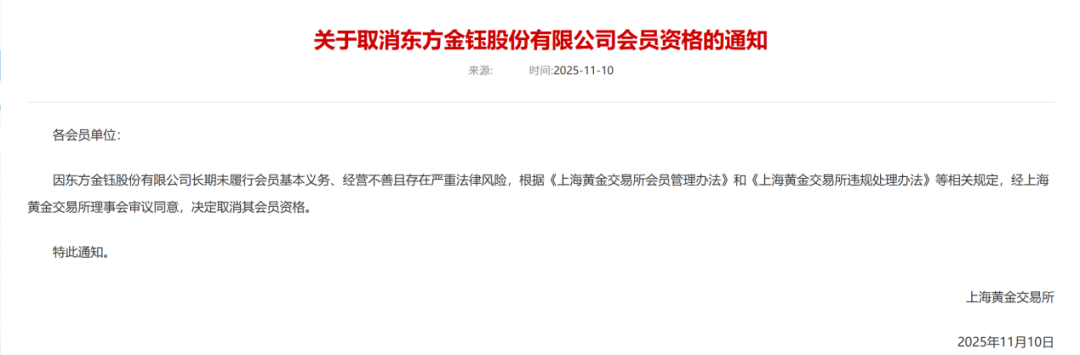 11月10日,上海黄金交易所在官网公告称,因东方金钰股份有限公司长期未履行会员基本义务、经营不善且存在严重法律风险,根据相关规定,决定取消其会员资格。
