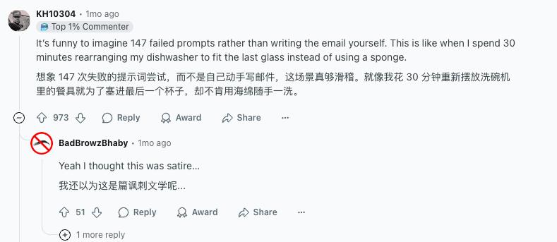 这则帖子在Reddit上迅速爆火,收获近万点赞和上千评论。有人称赞这是个「很棒的点子」,也有人吐槽折腾147次提示词,还不如自己写邮件快。
