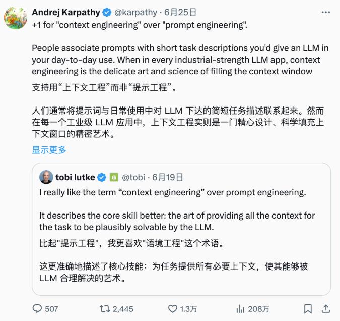 Context engineering是一种编程与系统设计活动,被视为AI系统设计的「下一代基础能力」。它在AI应用场景中搭建背景、工具、记忆、文档检索等全流程体系,让模型在可靠上下文支持下执行任务。